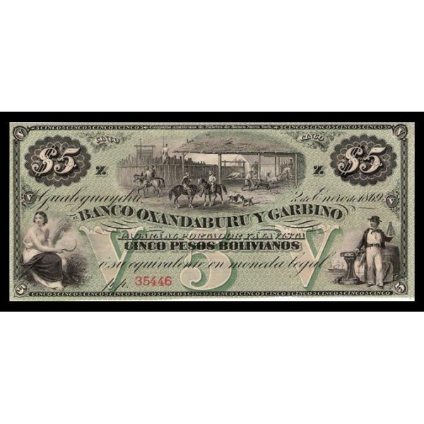 Argentina Pick. S1783r 5 Pesos Bolivianos 1869 UNC