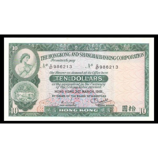 Hong Kong Pick. 182 10 Dollars 1959-83 UNC