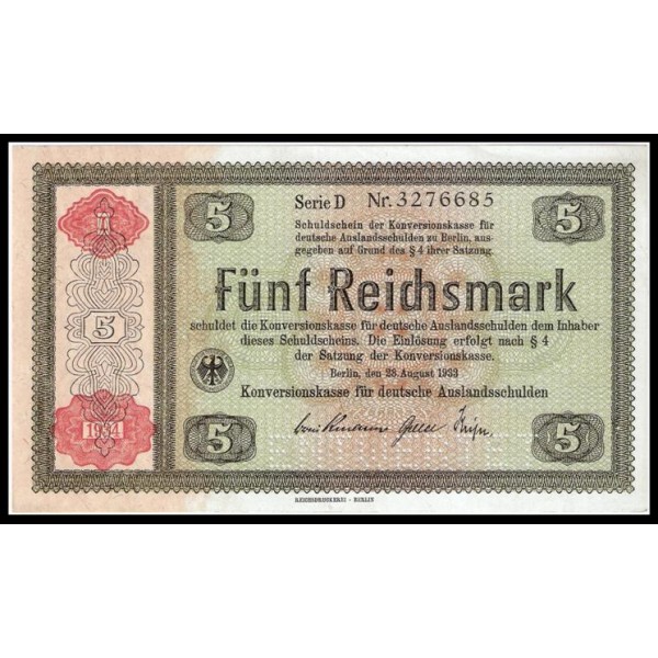 Allemagne Pick. 207s 5 Reichsmark 1934 NEUF-