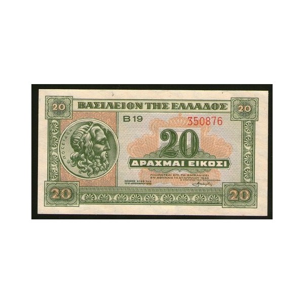 Grèce Pick. 315 20 Drachmai 1940 NEUF